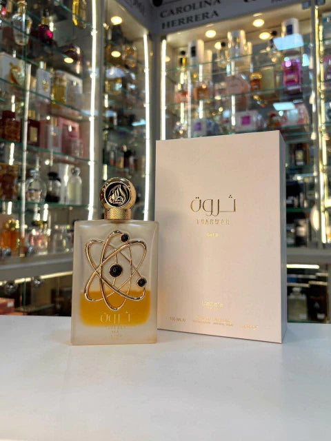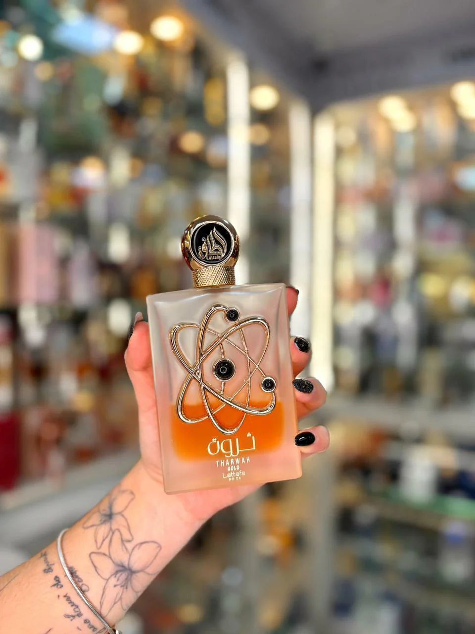 Tharwah Gold – O Perfume Feminino Com Design de Átomo Que Vai Explodir Seu Estilo!